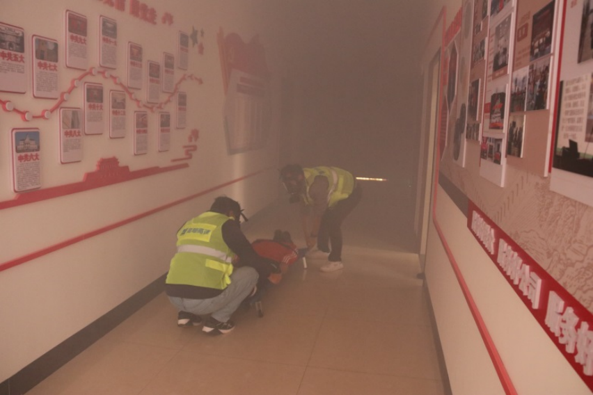 現(xiàn)場模擬辦公樓起火事故,只見濃煙中有的用毛巾捂住口鼻,低著頭、彎著腰按照逃生疏散路線迅速從辦公樓有序緊急疏散,安全人員頭戴防毒面具抬著單杠營救受傷人員,整個疏散過程緊張而不慌亂,人多而不擁擠,所有參訓(xùn)人員全程認(rèn)真對待、服從指揮。演練最后,參練人員進(jìn)行了滅火器、消防栓、防毒面具等器材的實(shí)操練習(xí)。